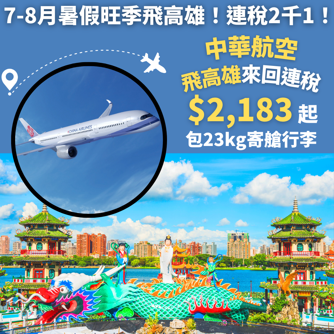 暑假旺季飛高雄!連稅2千1!香港飛高雄來回連稅$2,183起 – 中華航空