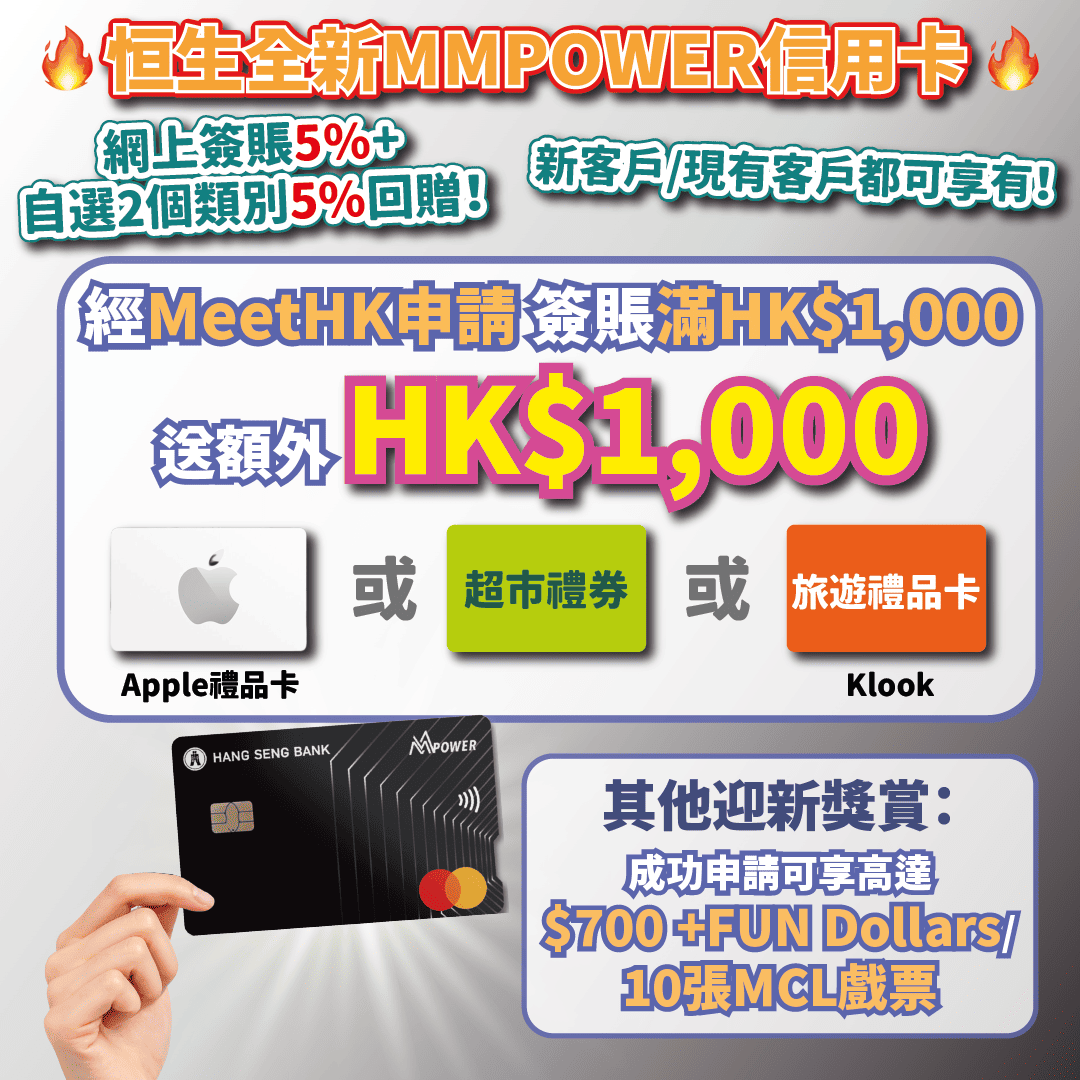 【恒生全新MMPOWER World Mastercard!網上簽賬5%+自選2個類別5%回贈!MeetHK獨家限時送HK$1,000】經MeetHK申請恒生全新MMPOWER World Mastercard,簽賬滿HK$1,000獨家送你額外HK$1,000 Apple禮品卡/超市禮券/Klook禮品卡!仲有高達$700 +FUN Dollars或10張MCL戲票等迎新禮遇!同時開立優進理財戶口更可獲額外$100 +FUN Dollars!