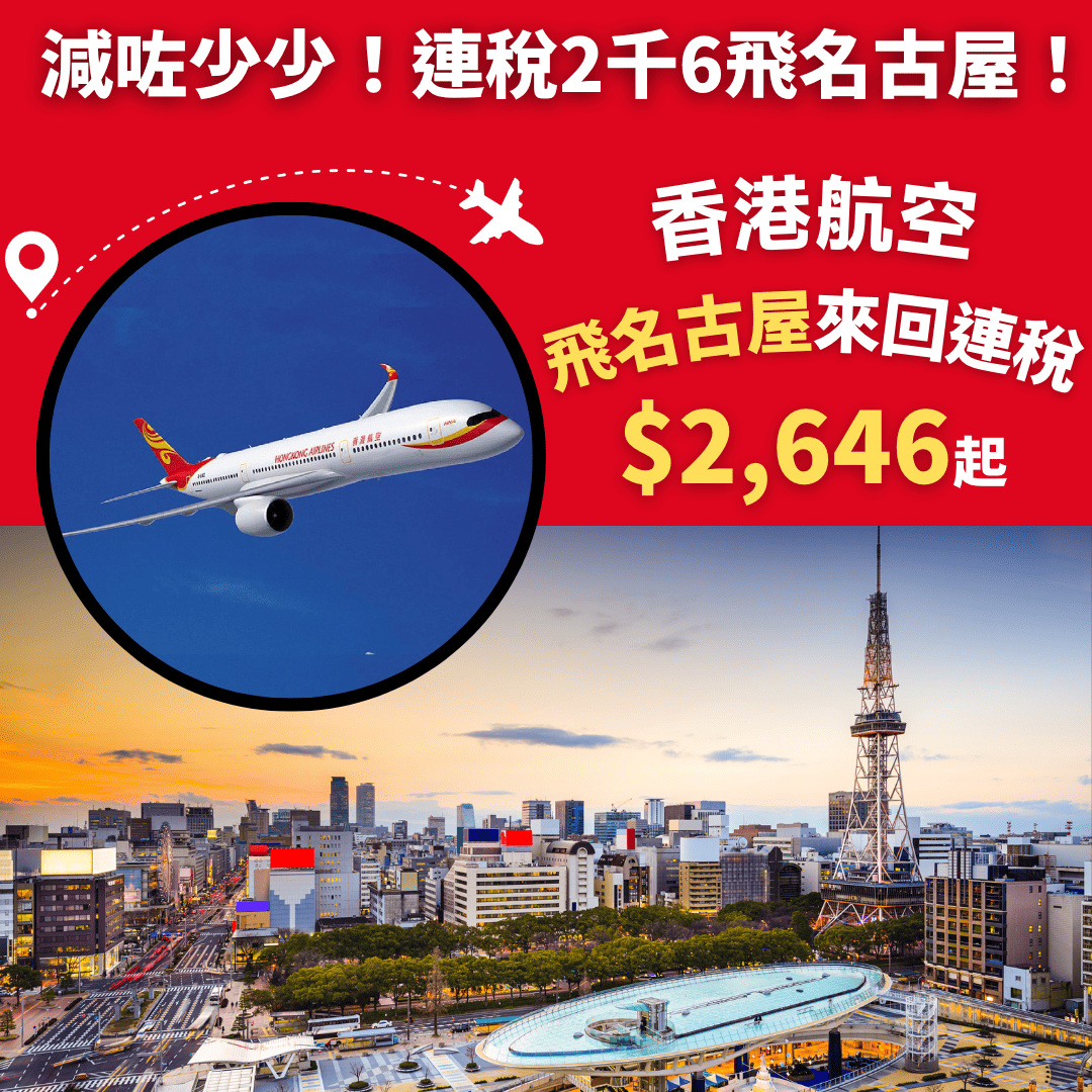 減咗少少!連稅2千6!8月下旬暑假出發都有!早機去午機返!香港飛名古屋來回連稅只需$2,646起 – 香港航空