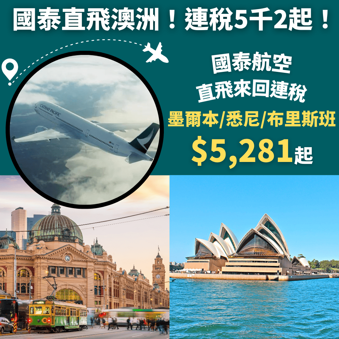澳航減!國泰跟減!連稅5千2起!國泰直飛澳洲!香港直飛悉尼/墨爾本/布里斯班來回連稅$5,281起 – 國泰航空 (優惠至7月7日)