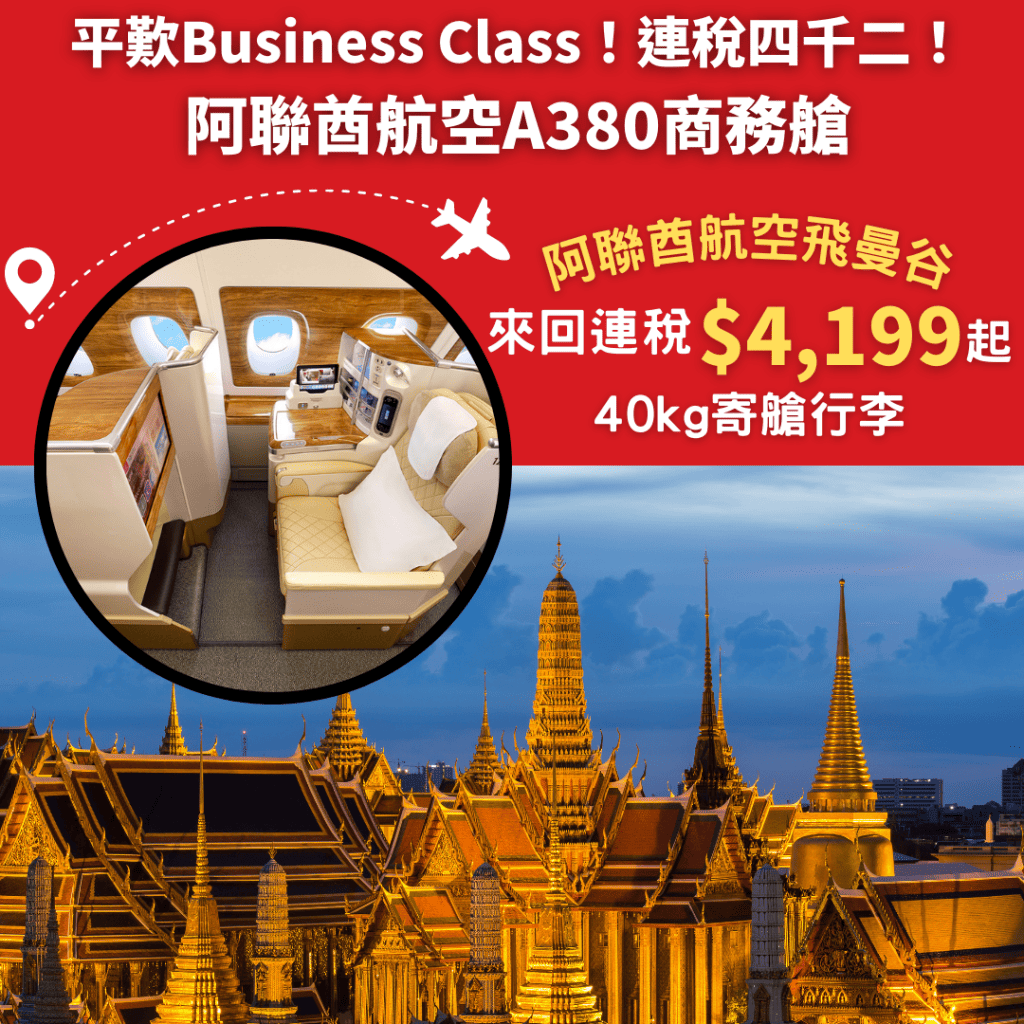 平歎Business Class!連稅四千二!40kg寄艙行李!明年3月31日前出發!阿聯酋航空A380商務艙飛曼谷來回連稅$4,199起 – 阿聯酋航空 (優惠至7月31日)