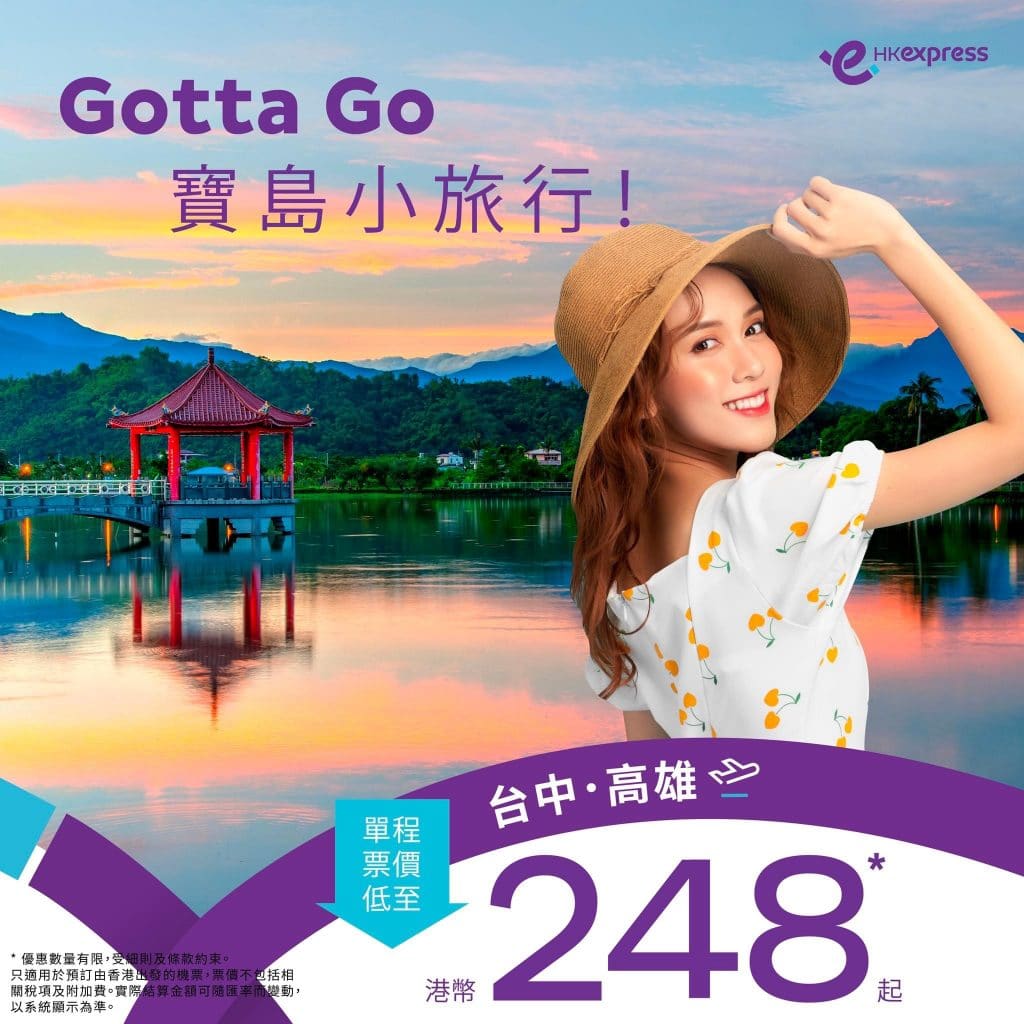 快閃台灣!限時優惠!香港飛台中/高雄單程只需$248起 – HK Express (優惠至8月16日)