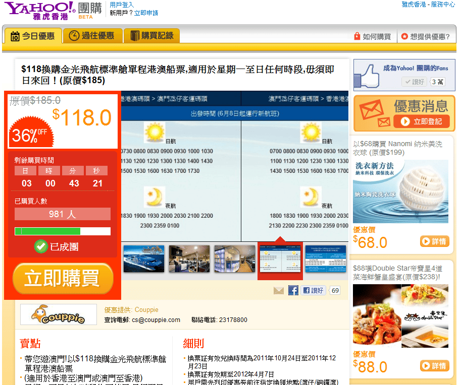 Yahoo!團購 $118換購金光飛航標準艙單程港澳船票,適用於任何時段,毋須即日來回!(原價$185) – (至10月19日)