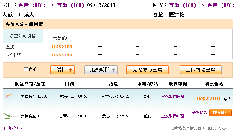 去同回仲可以揀坐A380航班,去程:KE608 00:55-05:20,回程:KE607 20:00-22:55