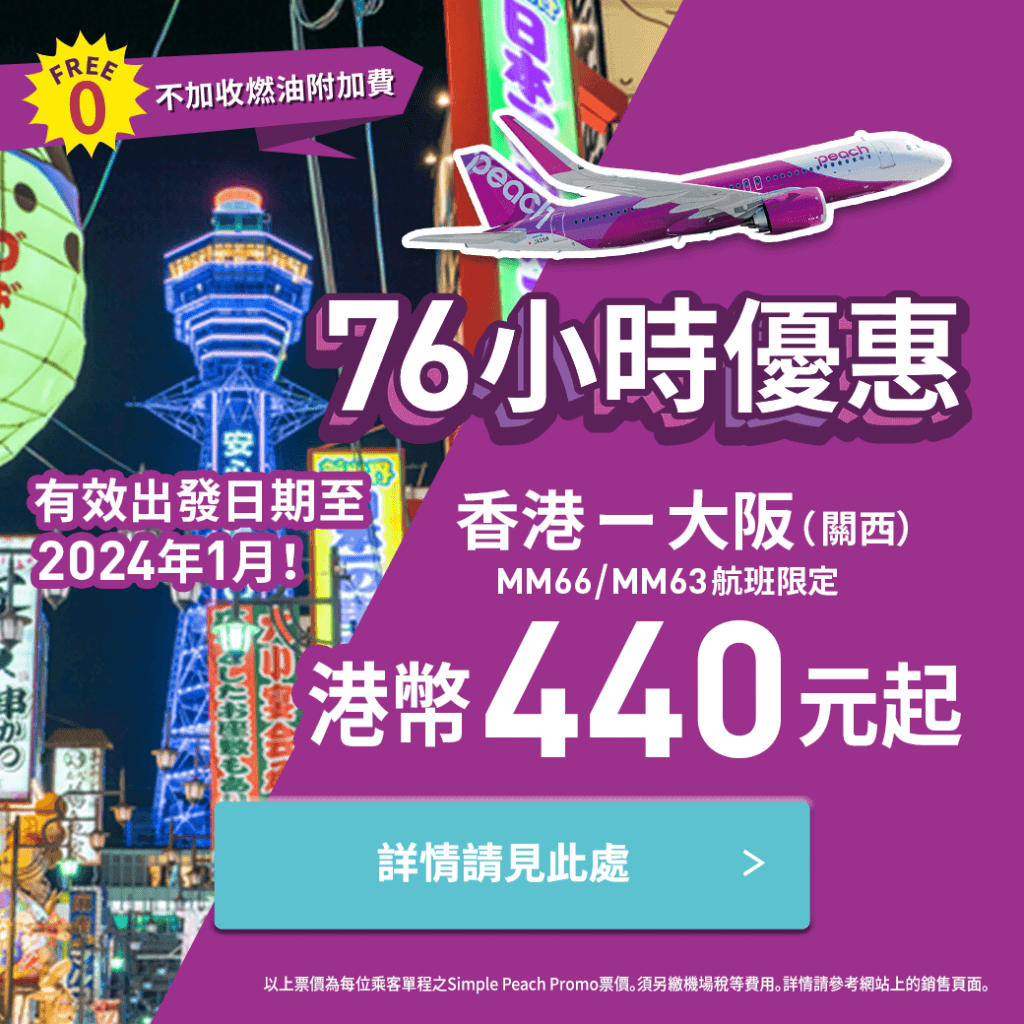 樂桃限時76小時優惠!明年1月31日前出發!香港飛大阪單程只需$540起 (不收燃油附加費) – 樂桃航空 (優惠至10月8日)