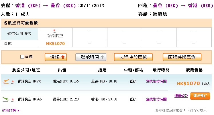 以11月來講,曼谷算平了,而且去程係坐 HX771 07:55-10:05 或 HX775 12:10-14:05,時間可以,回程航班無限制,睇返供應