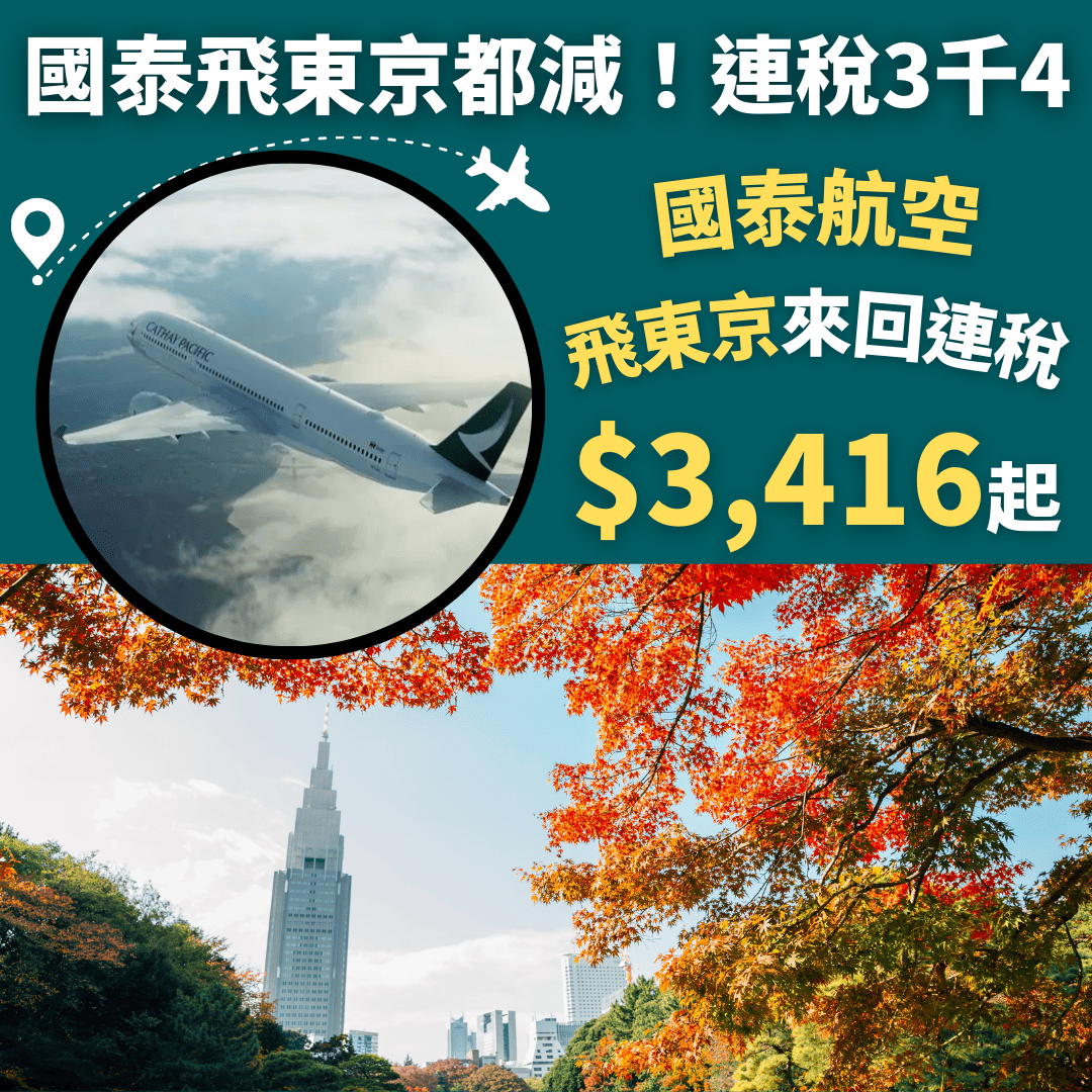 東京都減!國泰飛東京連稅3千4!紅葉季都有!明年2月29日前出發!香港飛東京來回連稅只需$3,416起 – 國泰航空 (優惠至10月25日)