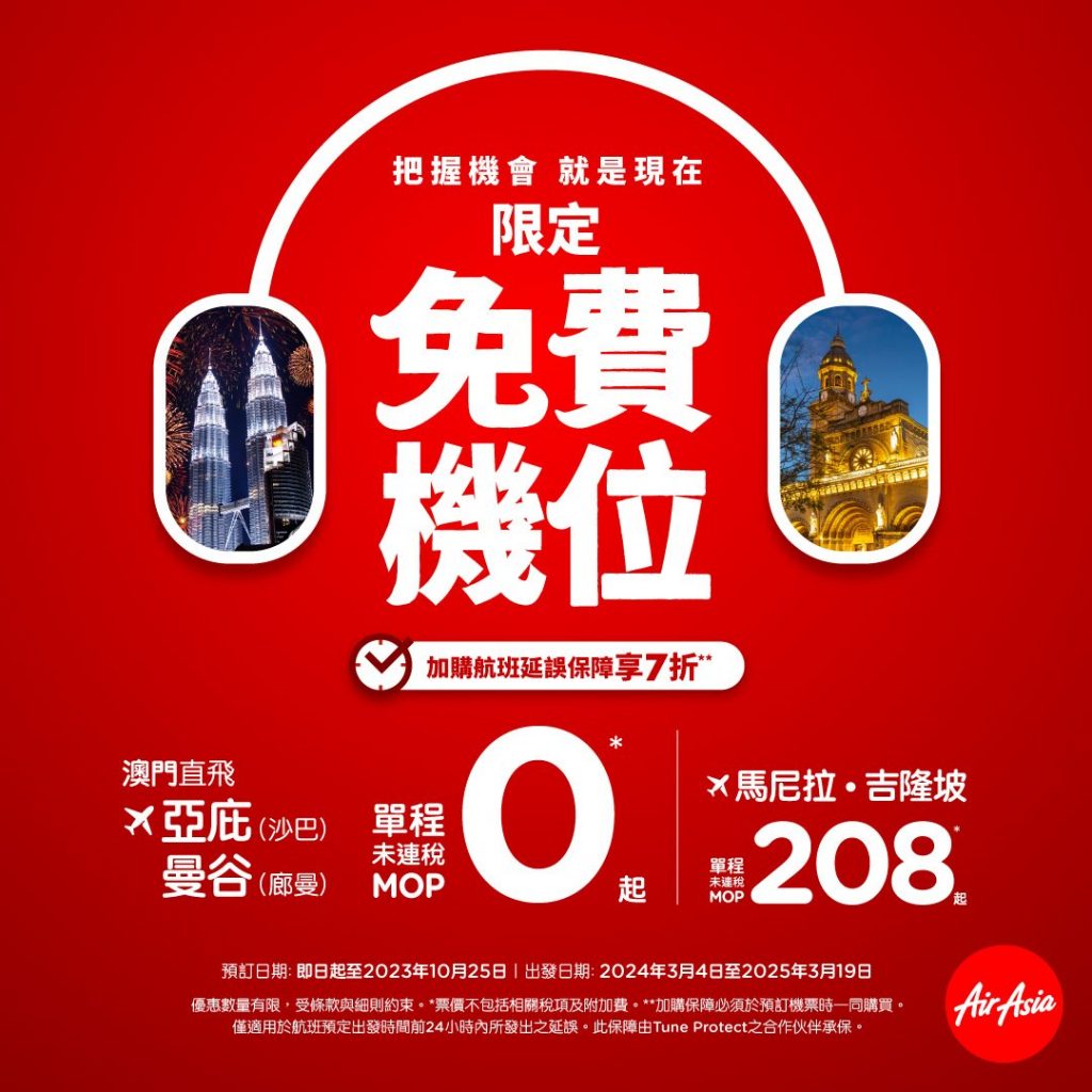 嘩!係$0機票!$0飛曼谷/沙巴!澳門飛曼谷/沙巴$0、深圳飛曼谷/沙巴$0,來回連稅$611起 – AirAsia (優惠至10月25日)