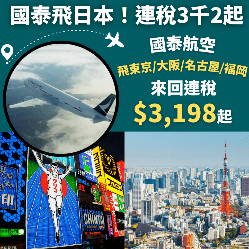 國泰飛日本!連稅3千2起!明年2月29日前出發!香港飛東京/大阪/名古屋/褔岡來回連稅$3,198起 – 國泰航空 (優惠至10月25日)