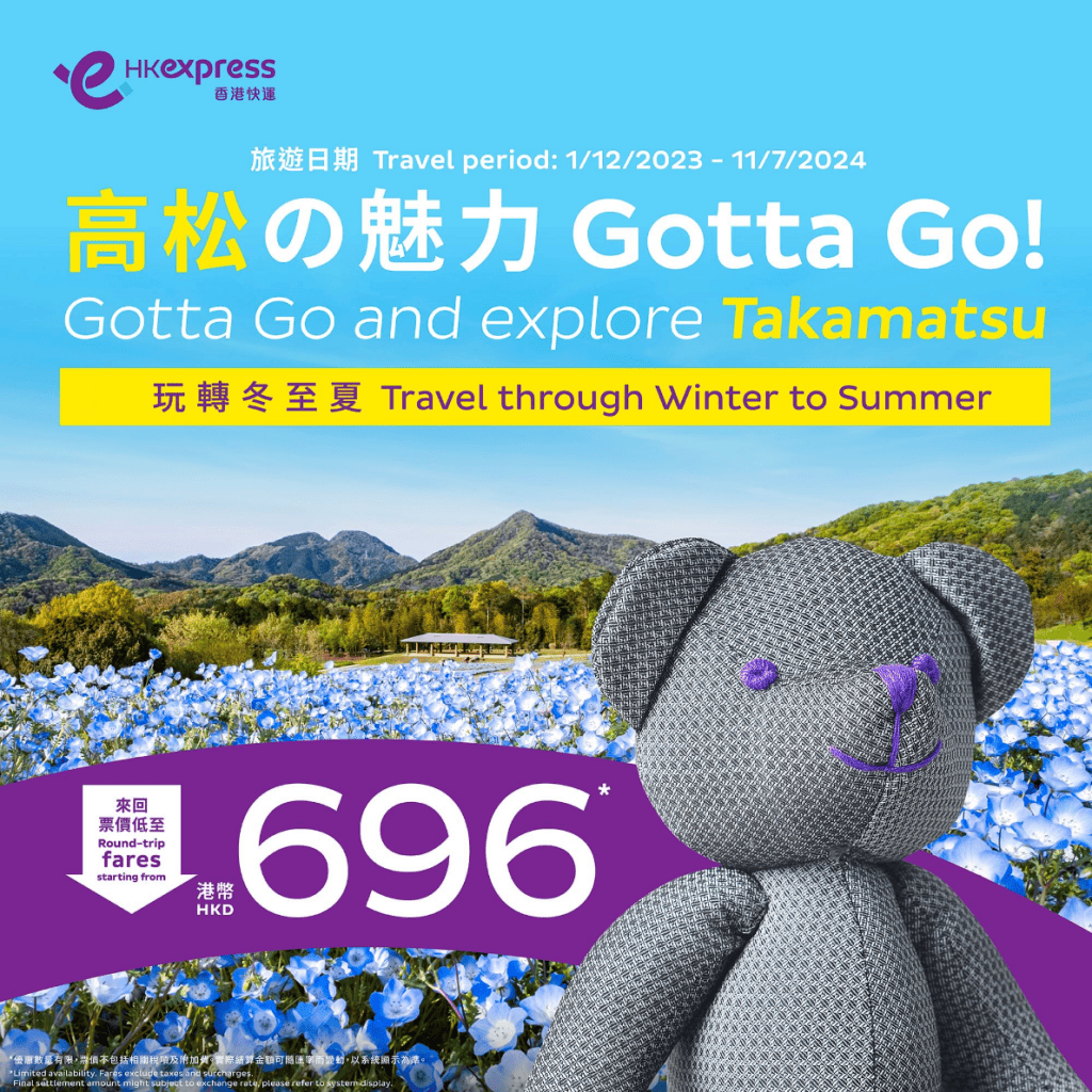 到高松優惠!明年7月11日前出發!香港飛高松單程只需$348起 – HK Express (優惠至10月26日)