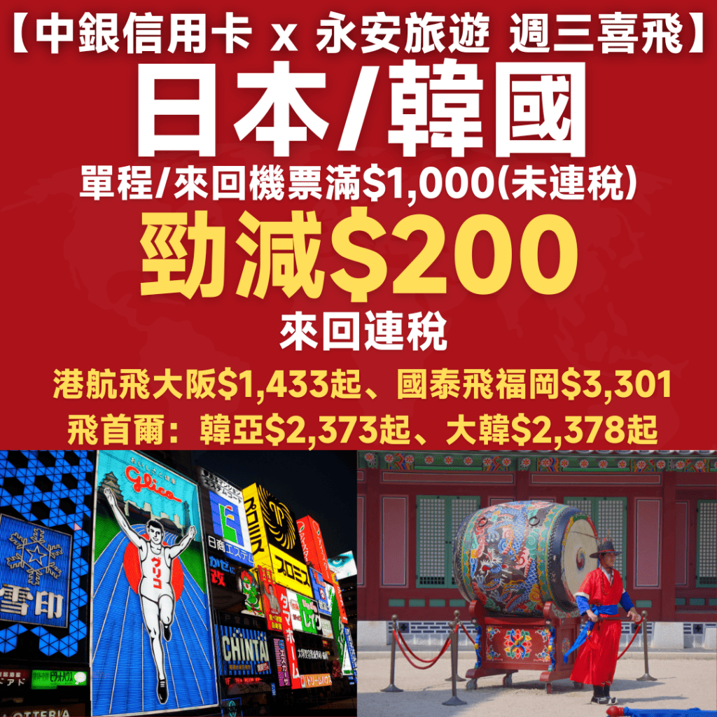【中銀信用卡 x 永安旅遊 週三喜飛】預訂日本/韓國 單程/來回機票 滿$1,000(未連稅)勁減$200!