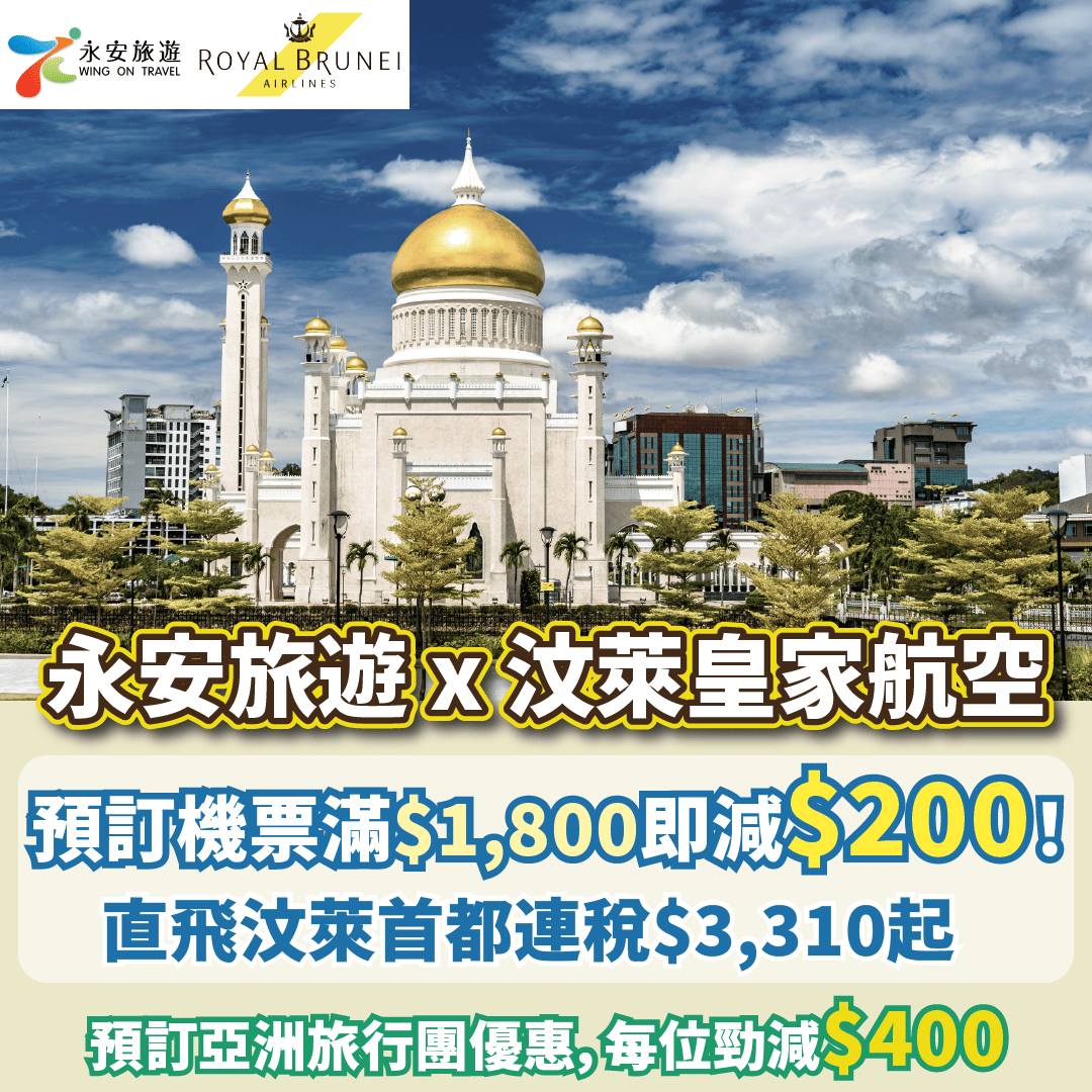 【永安旅遊 x 汶萊皇家航空】減減減!連稅3千3直飛汶萊!預訂機票滿$1,800即減$200!直飛汶萊來回連稅只需$3,310起!亞洲旅行團每位勁減$400!