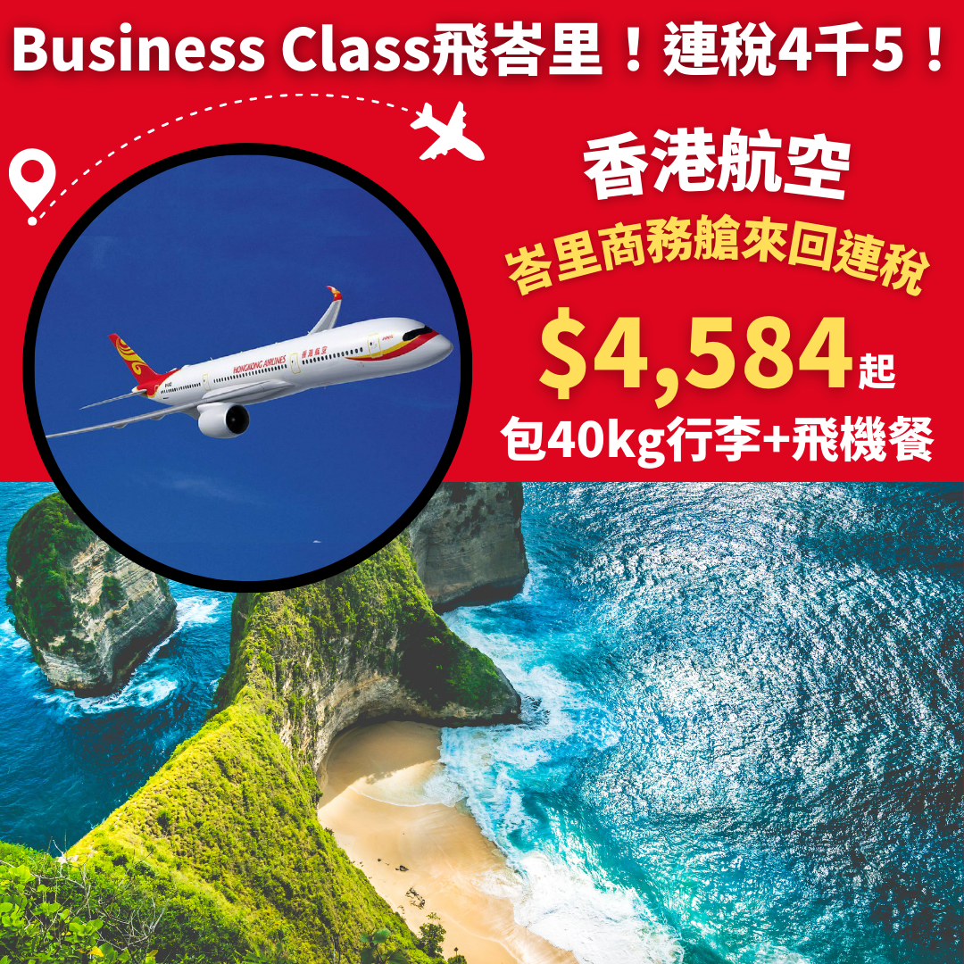 Business Class飛峇里島!連稅4千5!包40kg行李!香港飛峇里島商務艙二人同行來回連稅每人$4,584起 – 香港航空