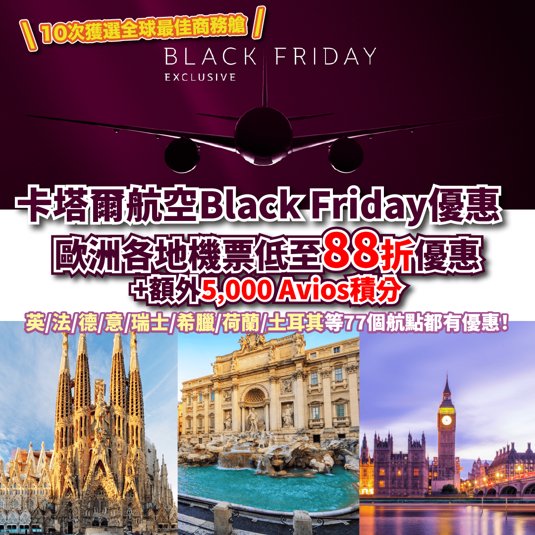 【卡塔爾航空Black Friday優惠】歐洲各地機票低至88折優惠+額外5,000 Avios積分!英/法/德/意/瑞士/希臘/荷蘭/土耳其等77個航點都有優惠!仲可以open jaw+玩埋多哈!出發日期可遠至明年6月!