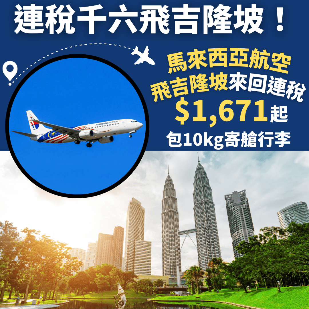 連稅千六飛吉隆坡!包10kg寄艙行李!明年9月28日前出發!香港飛吉隆坡來回連稅$1,648起 – 馬來西亞航空 (優惠至12月4日)