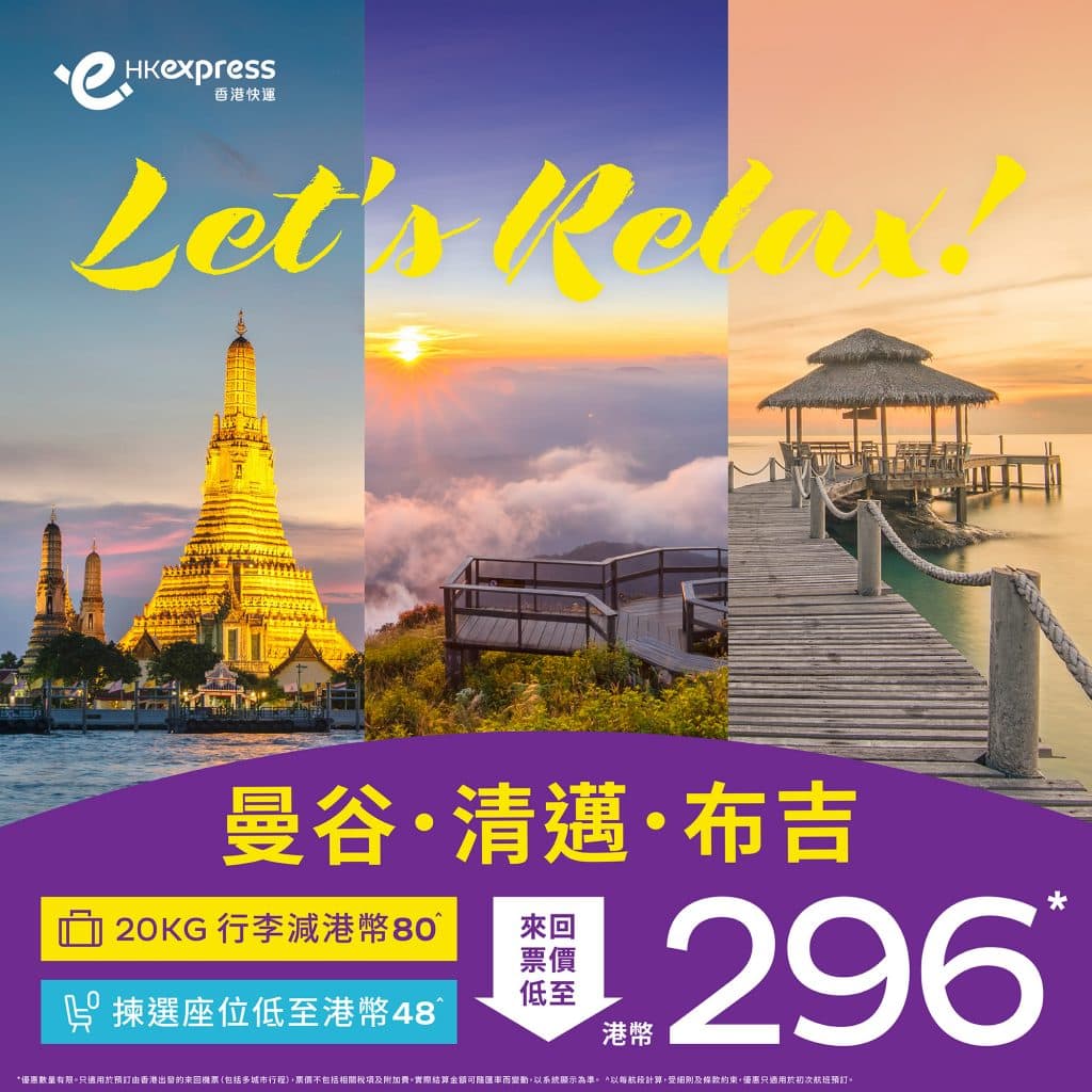 泰國限時優惠!明年3月15日前出發!香港飛曼谷/布吉/清邁單程只需$148起 – HK Express (優惠至11月23日11:59pm)