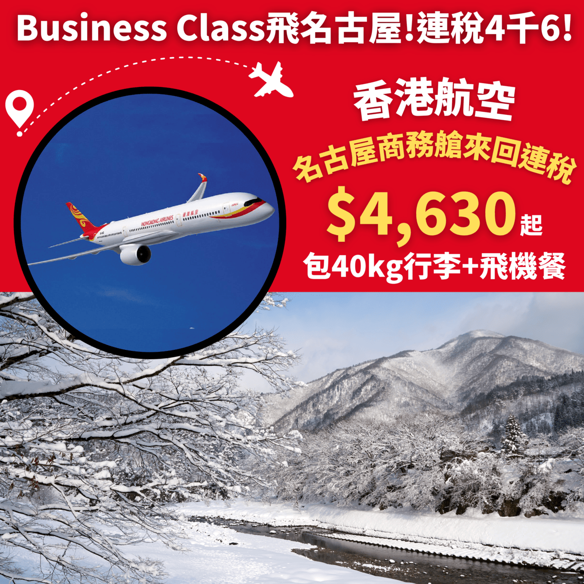 Business Class飛名古屋!連稅4千6!明年3月21日前出發!包40kg行李!香港飛名古屋商務艙二人同行來回連稅每人$4,630起 – 香港航空 (優惠至1月31日)
