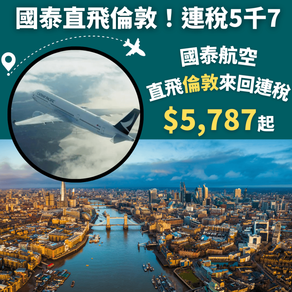 國泰直飛倫敦!連稅5千7!6月14日前出發!香港直航往返倫敦來回連稅只需$5,787起 – 國泰航空 (優惠至1月2日)