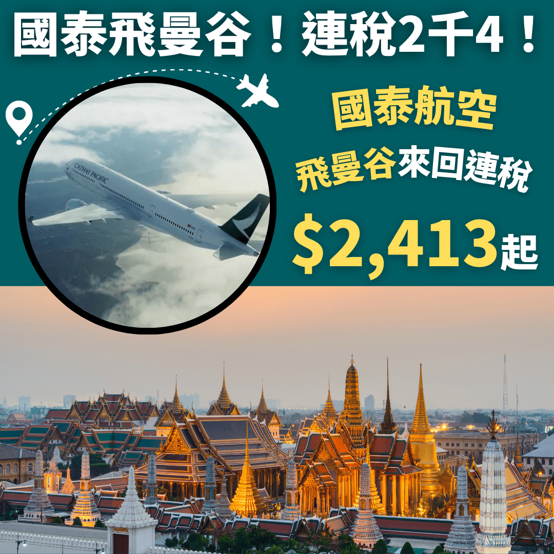 國泰飛曼谷!連稅2千4!可早去晚返!香港飛曼谷二人同行來回連稅每人只需$2,413起 – 國泰航空 (優惠至1月2日)