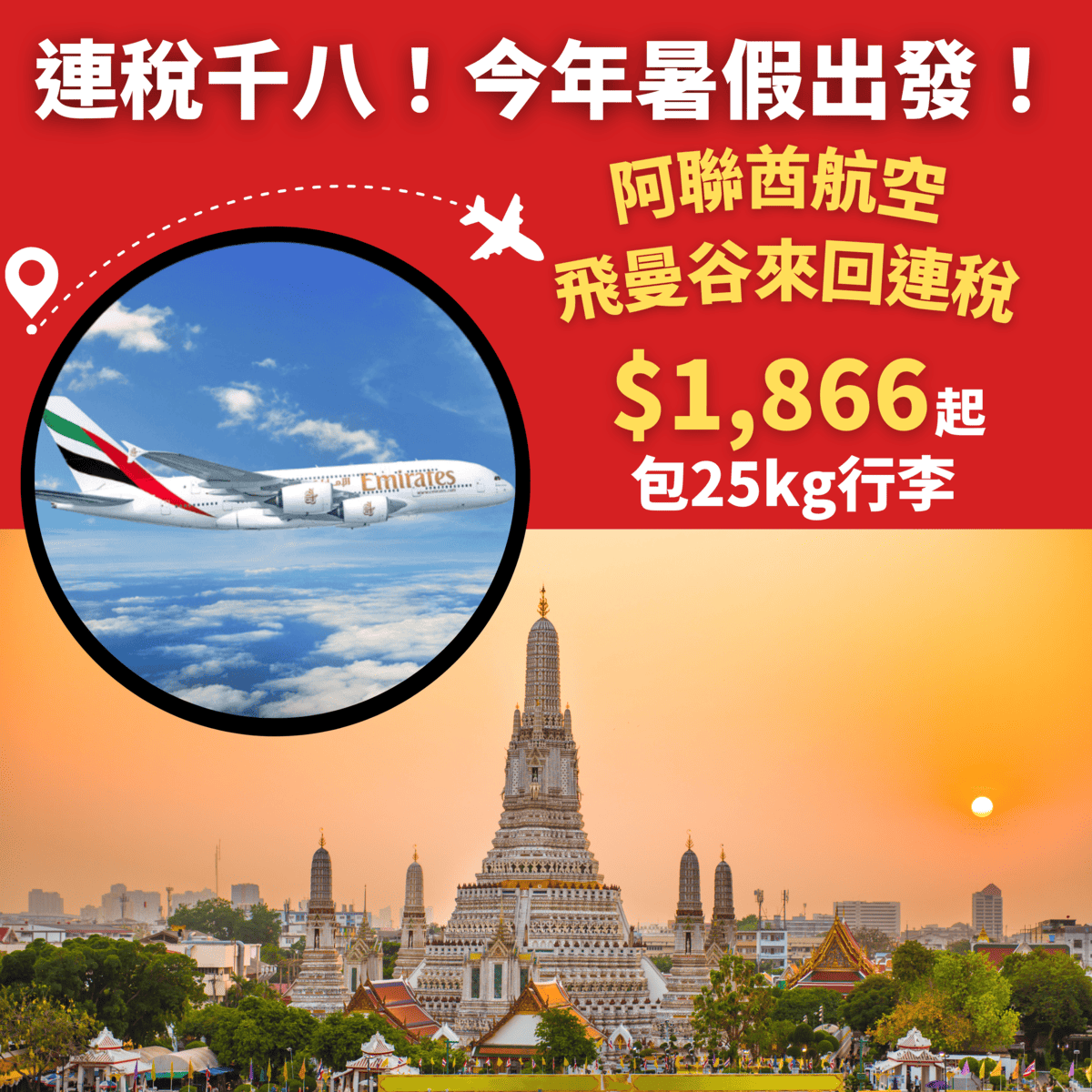 香港飛曼谷來回連稅只需$1,866起,包25kg行李