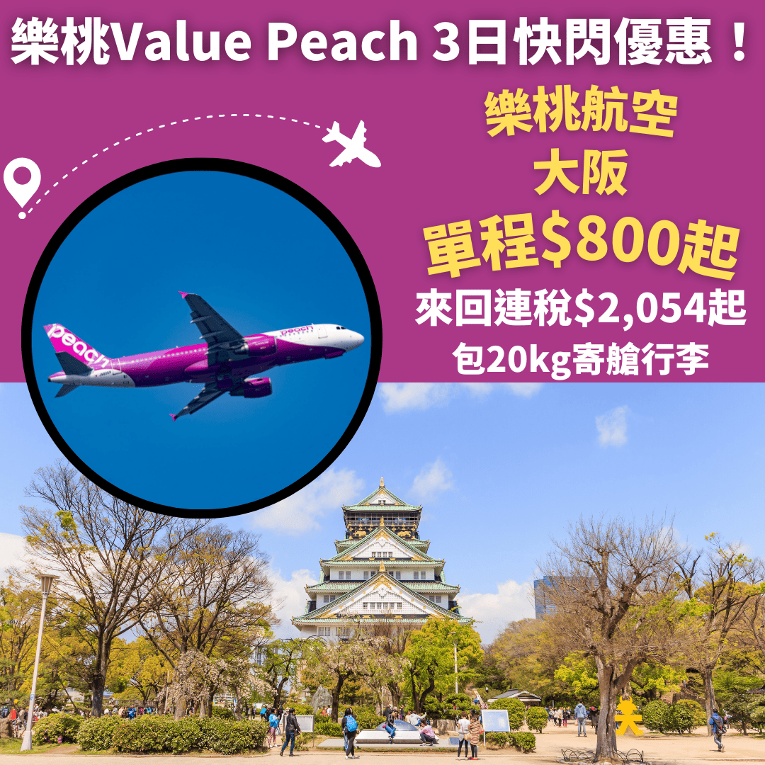 樂桃Value Peach 3日快閃優惠!包20kg寄艙行李!10月29日前出發!香港飛大阪單程只需$800起 (不收燃油附加費) – 樂桃航空 (優惠至1月19日)