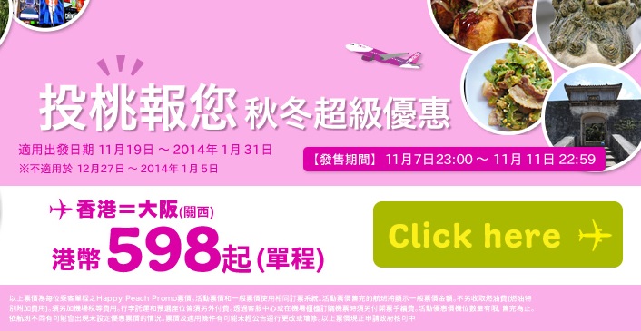 http://www.flypeach.com/campaign/yoridori_20131107.aspx (大阪至香港4,980円須經樂桃英文網站購買)
