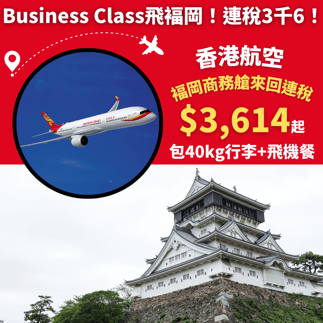 Business Class飛褔岡!連稅3千6!40kg行李!香港飛褔岡商務艙二人同行來回連稅每人$3,614起 – 香港航空 (優惠至1月31日)