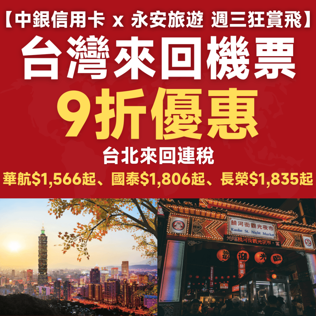 【中銀信用卡 x 永安旅遊 週三狂賞飛】平飛台灣之選!台灣來回機票9折優惠!台北來回連稅:華航$1,566起、國泰$1,803起、長榮$1,844起