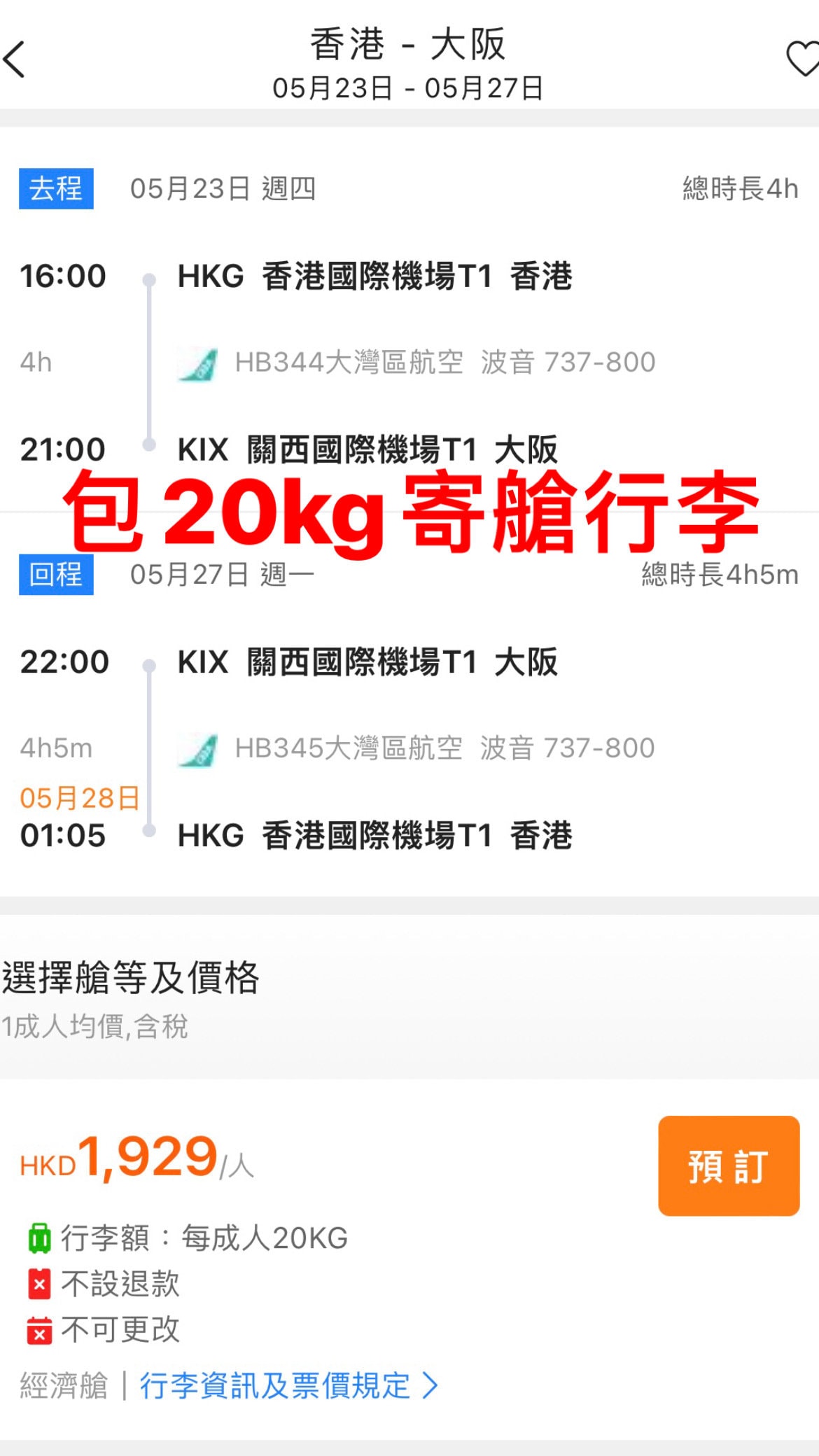飛東京/ 大阪優惠!7月13日前出發!包20kg行李!香港飛大阪來回連稅只需$1,911起、東京$2,064起 – 大灣區航空 (優惠至3月31日)
