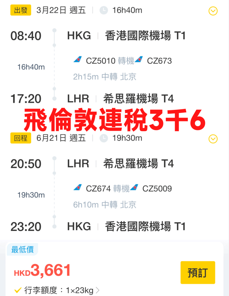 係平既!飛倫敦連稅3千6!6月15日前出發!23kg行李!香港飛倫敦來回連稅只需$3,661起 – 中國南方航空 (優惠至3月15日)