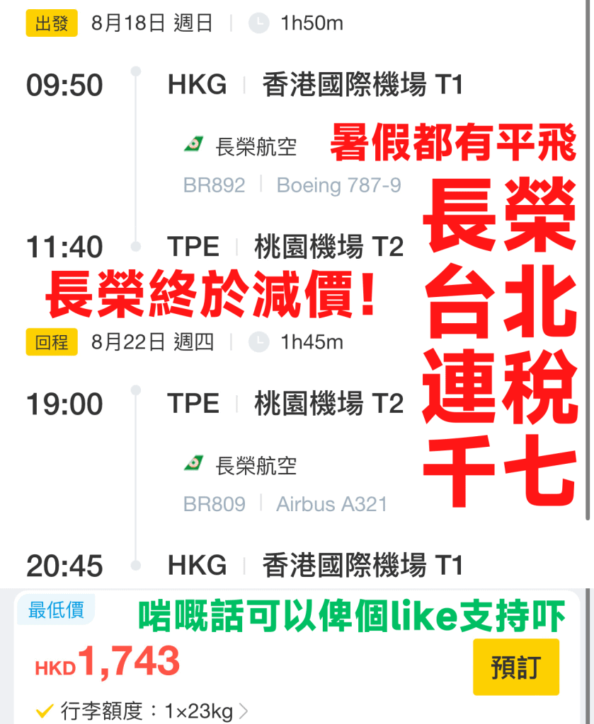 嘩!華航飛台北減咗咁耐,長榮今日終於肯減價!連稅千七!