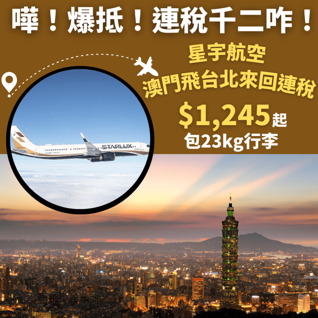嘩!爆抵!連稅千二咋!星宇航空澳門飛台北!包23kg寄艙行李!12月31日前出發!澳門飛台北來回連稅$1,245起 – 星宇航空