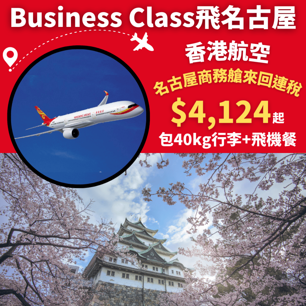 Business Class飛名古屋!連稅4千1!3月20日前出發!包40kg行李!香港飛名古屋商務艙來回連稅只需$4,124起 – 香港航空