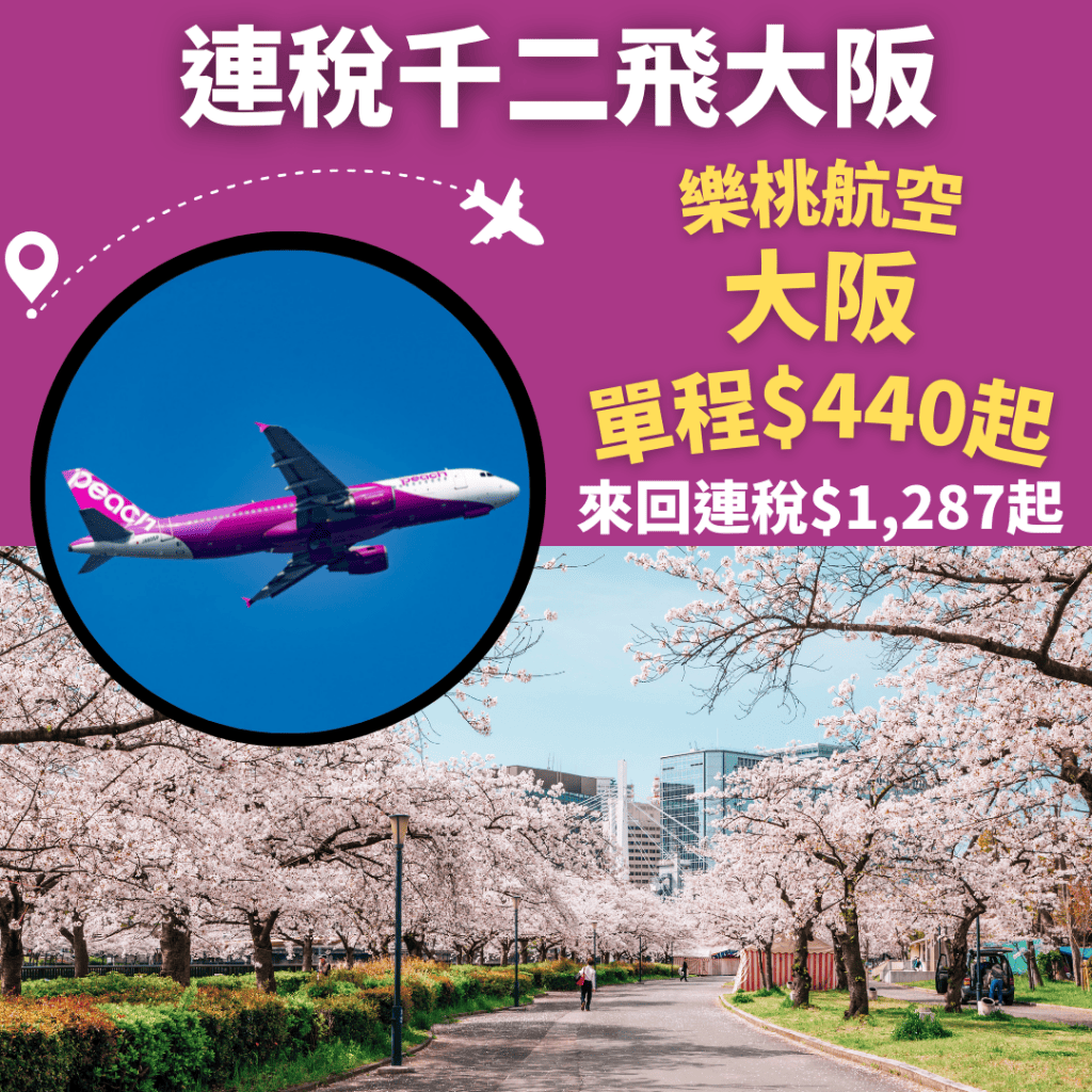 連稅千二飛大阪!限時3日!香港飛大阪單程只需$440起 (不收燃油附加費) – 樂桃航空 (優惠至2月21日)