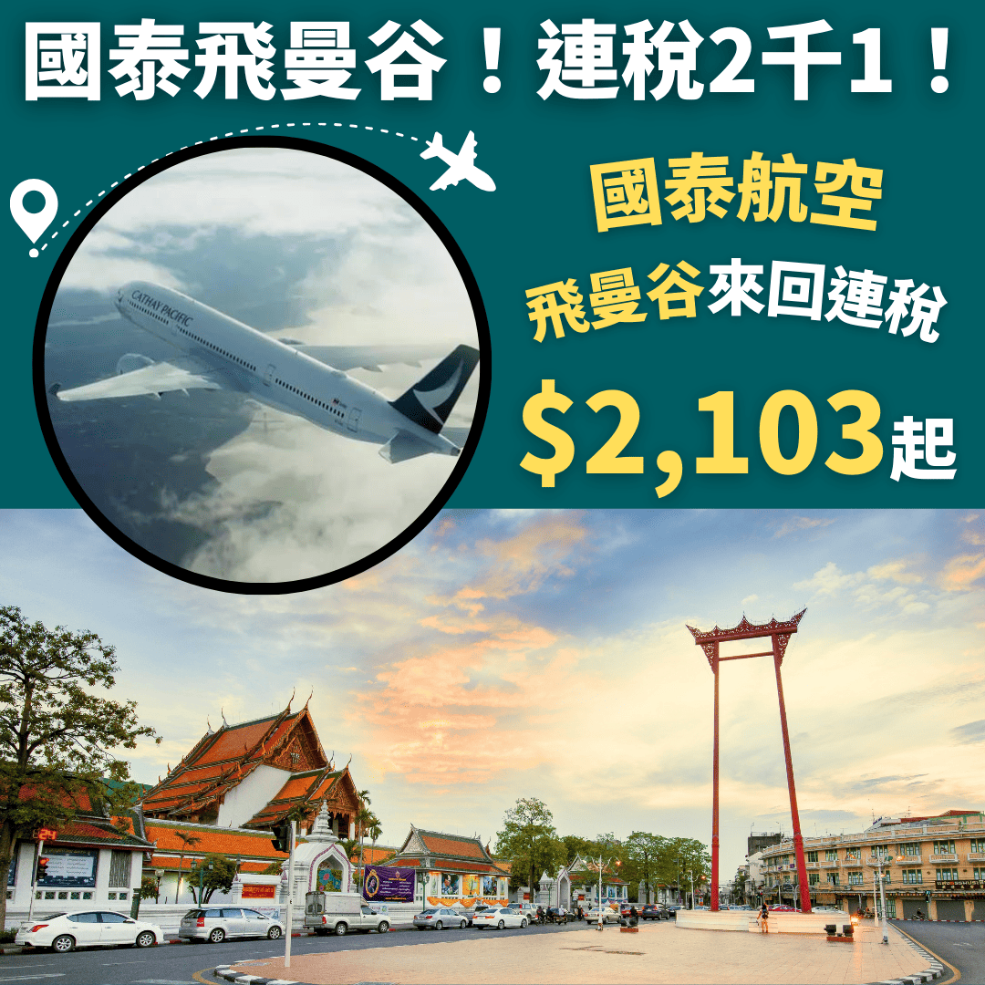 國泰飛曼谷又有平!連稅2千1起!可早去晚返!香港飛曼谷來回連稅只需$2,103起 – 國泰航空 (優惠至2月29日)