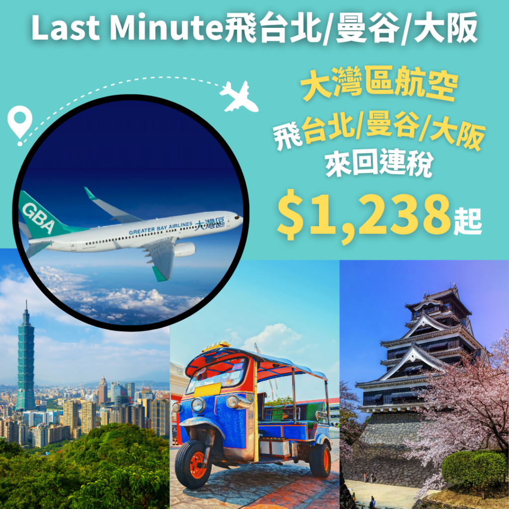 Last Minute飛台北/曼谷/大阪!連稅千二起!3月25日前出發!香港飛台北、曼谷、大阪來回連稅只需$1,238起 – 大灣區航空 (優惠至3月4日)