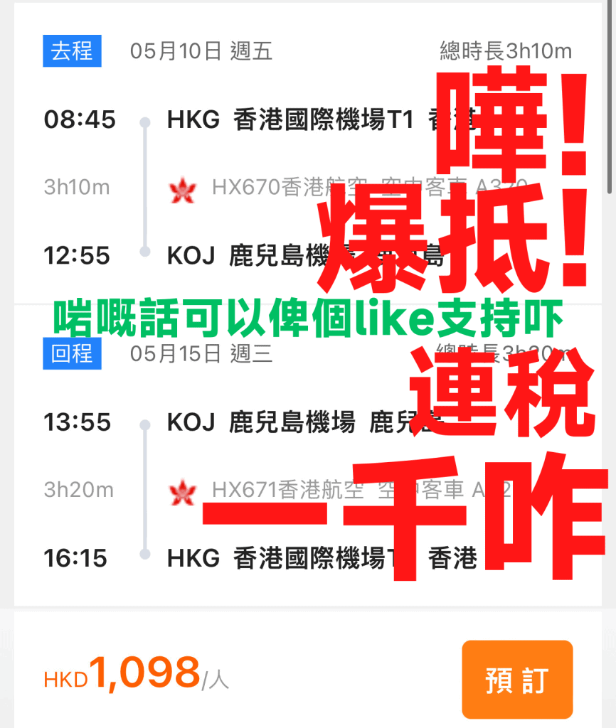 update: 熊本都有連稅千一平飛(詳情:https://www.meethk.com/135750)