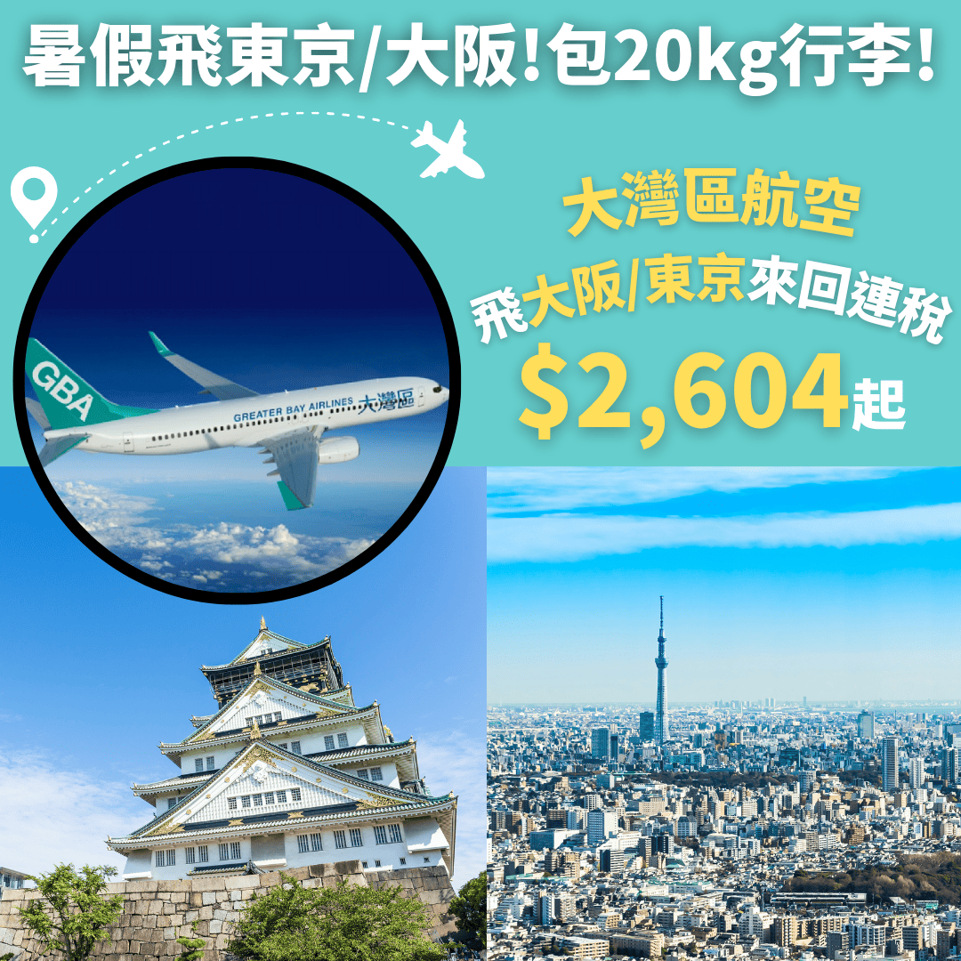 大灣區航空暑假旺季香港飛大阪來回連稅只需$2,604起、東京$3,464起,包20kg行李!