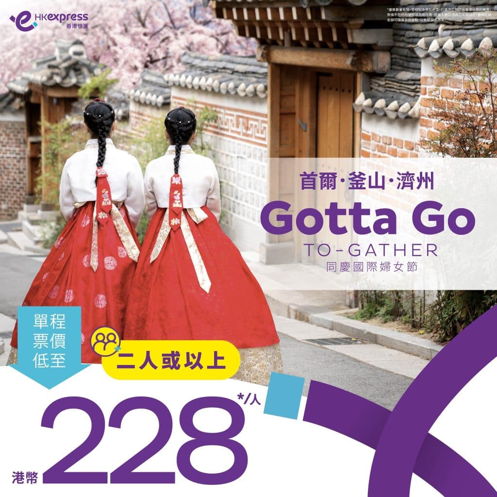 韓國限時優惠!7月11日前出發!香港飛首爾/釜山/濟州二人同行單程每人$228起 – HK Express (優惠至3月10日)