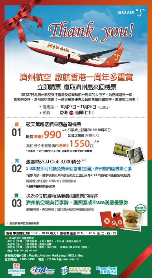 濟州航空為慶祝來往香港及首爾航班啟航一周年既大日子,推出左周年超低價,於2011年10月27日啟航日至11月25日出發的香港首爾(仁川)來回機票,票價僅由港幣1,550起