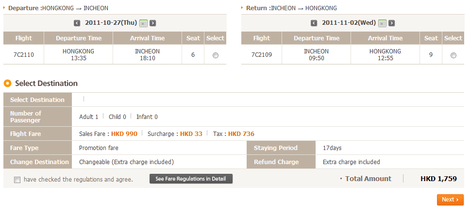 而係網上訂購10月27日啟航日出發航班,更只需$990,我地以27/10 – 2/11為例,只需$990 + $769 (稅) = 機票連稅$1,759