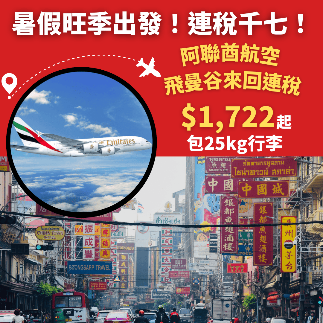 香港飛曼谷來回連稅只需$1,722起,包25kg行李,比之前平百零蚊!