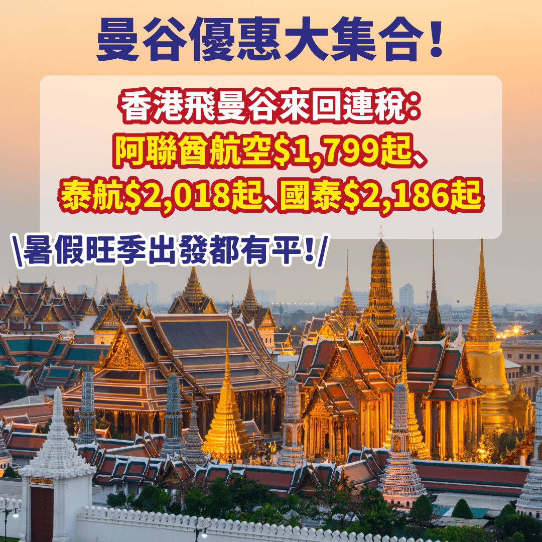曼谷優惠大集合!暑假旺季出發都有平!連稅千七起!來回連稅:阿聯酋航空$1,799起、泰航$2,018起、國泰$2,186起 (優惠至3月31日)