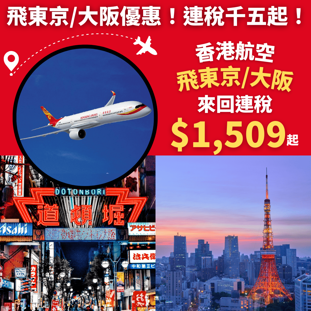 港航連稅千五飛大阪,千六飛東京!6月27日前出發!香港飛東京/大阪來回連稅只需$1,509起 – 香港航空 (優惠至4月9日)