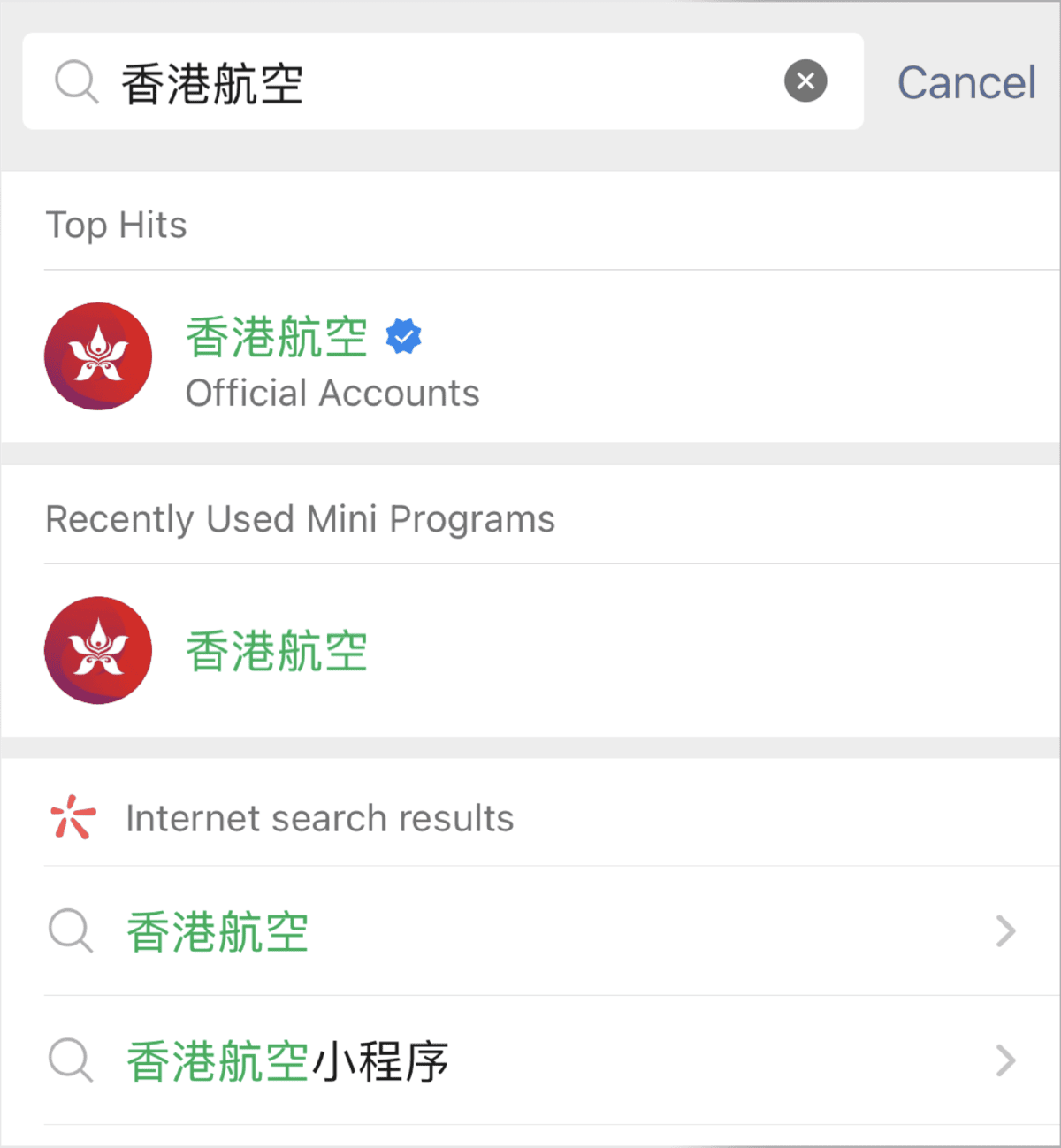 可以WeChat直接search ‘香港航空’,喺對話入面就會見到小程序,再撳 ‘機票預訂’ 就可以預訂。