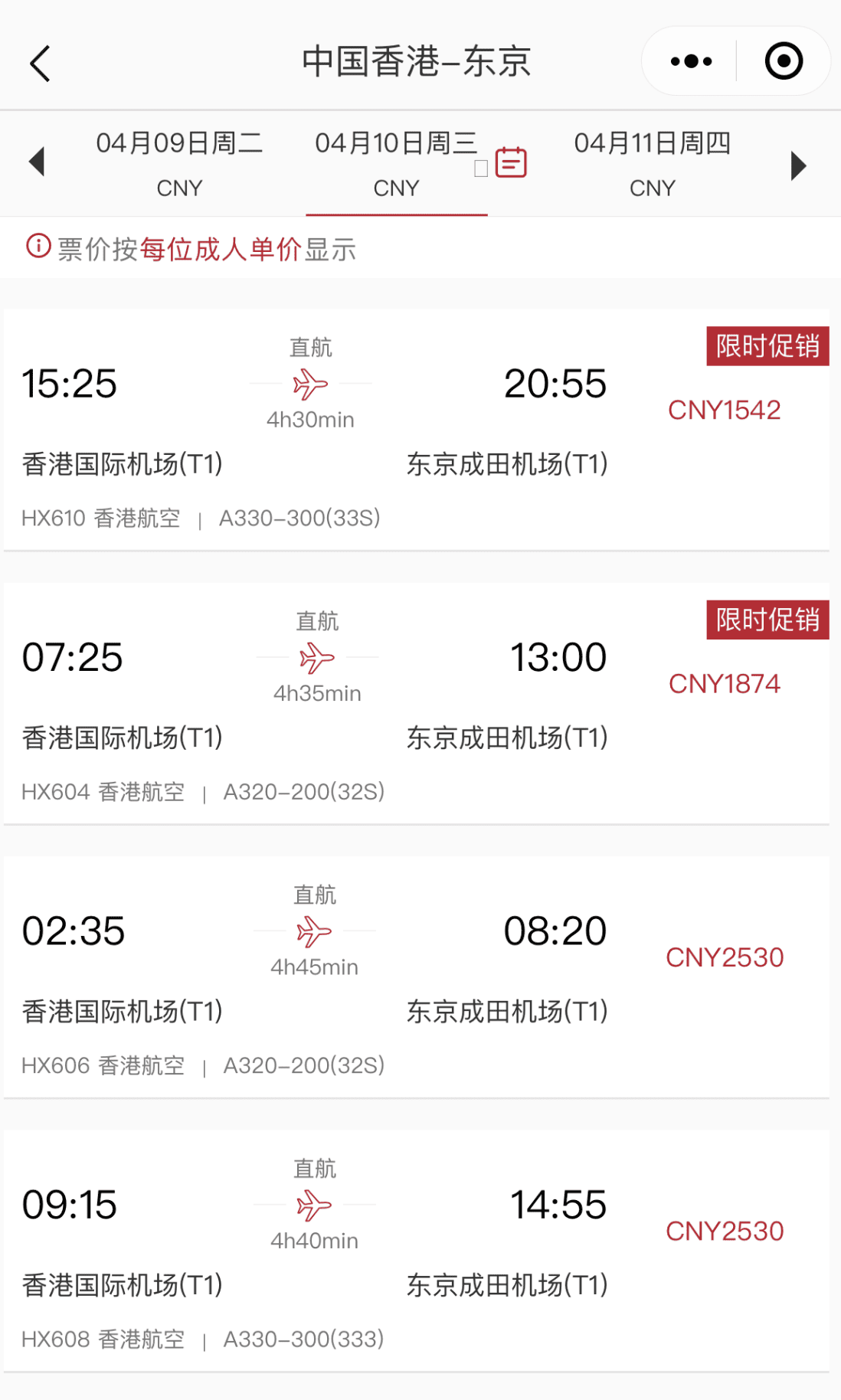 回程 HX603 08:55-12:10:4月10,11,12,13,14,15,16,17,18,19,20,21,22,23,24,25,27,28,29,30日、5月1,8,9,10,11,12,13,14,15,16,17,18,19,20,21,22,23,24,25,27,28,29,30,31日、6月1,2,3,4,6,7,8,15,16,17,18,19,20,22,23,24,25,27,28,29日、7月3日