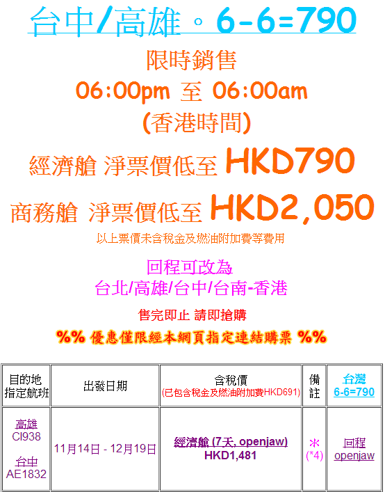 如果唔想夜機出發,華航仲有隻12月19日前淡季台北、台中、高雄、台南二人同行優惠,只需$790,連稅$1,481,可以open jaw (詳情:https://www.meethk.com/?p=10837)