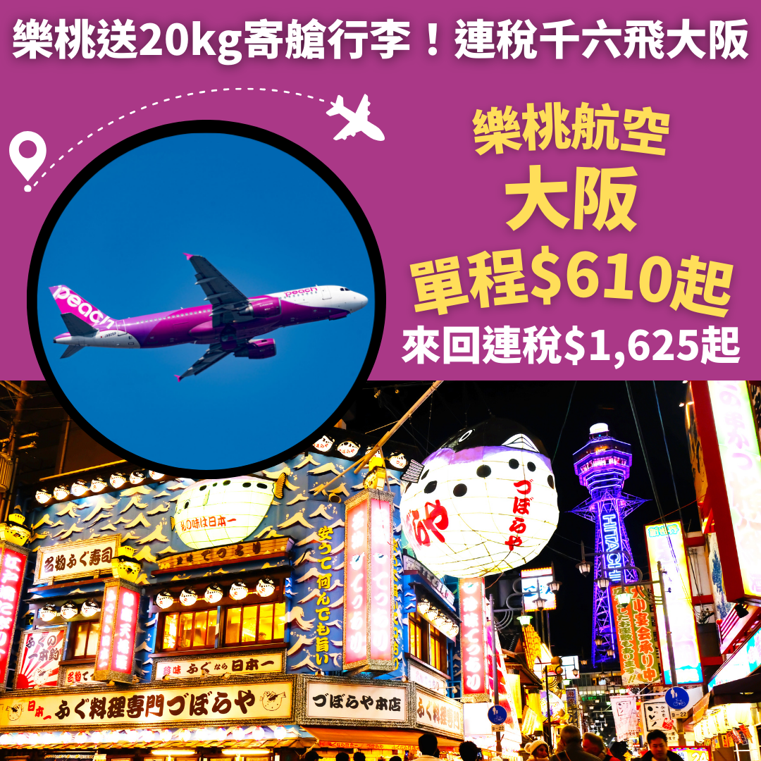 連稅千六飛大阪!送20kg寄艙行李!10月29日前出發!香港飛大阪單程只需$610起 (不收燃油附加費) – 樂桃航空 (優惠至4月21日)