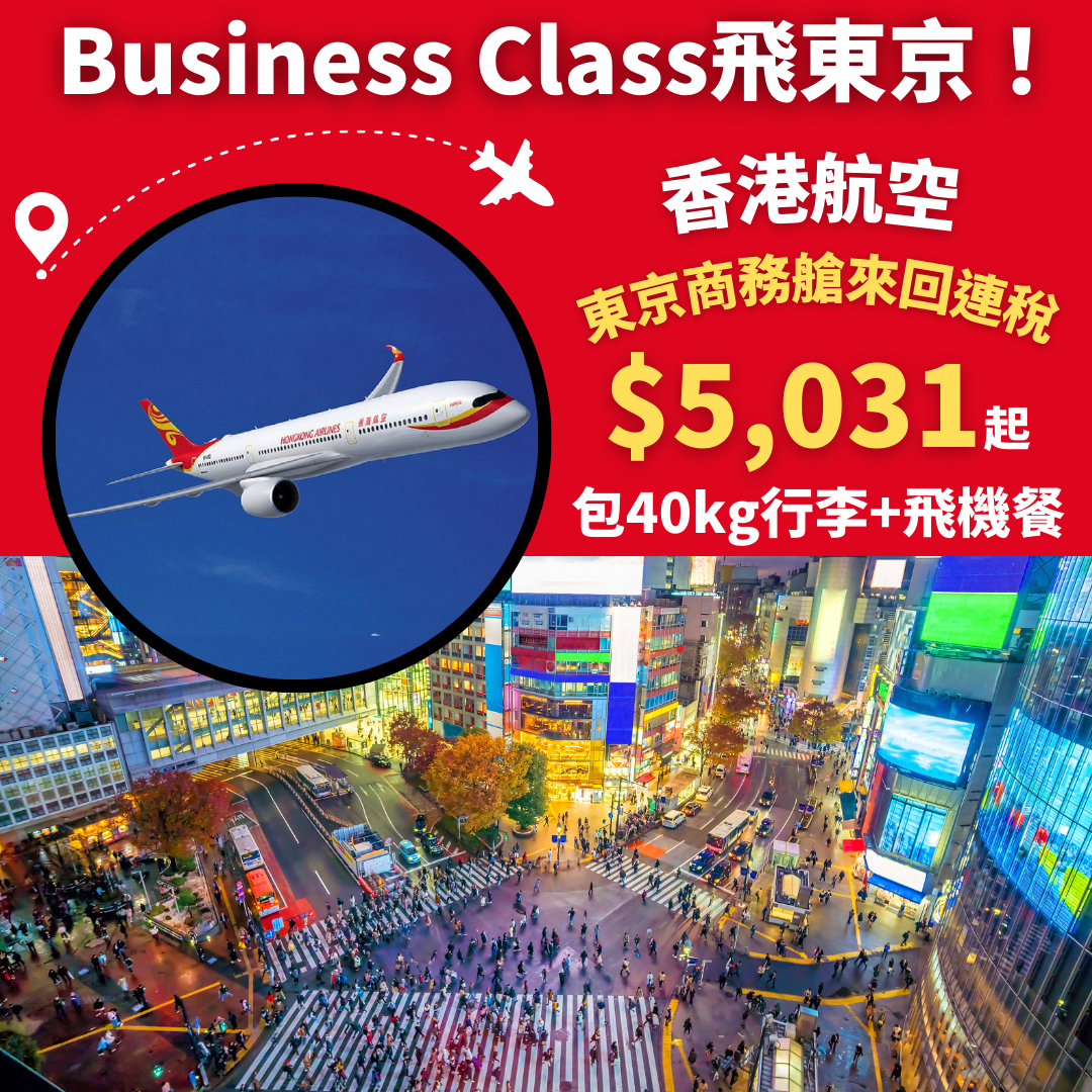 Business Class飛東京!連稅5千!40kg行李!香港飛東京商務艙二人同行來回連稅每人$5,031起 – 香港航空 (優惠至6月26日)