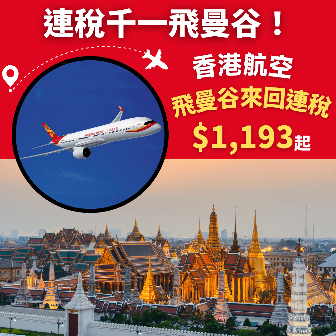 連稅千一飛曼谷!6月27日前出發!香港飛曼谷來回連稅$1,193起 – 香港航空 (優惠至5月31日)